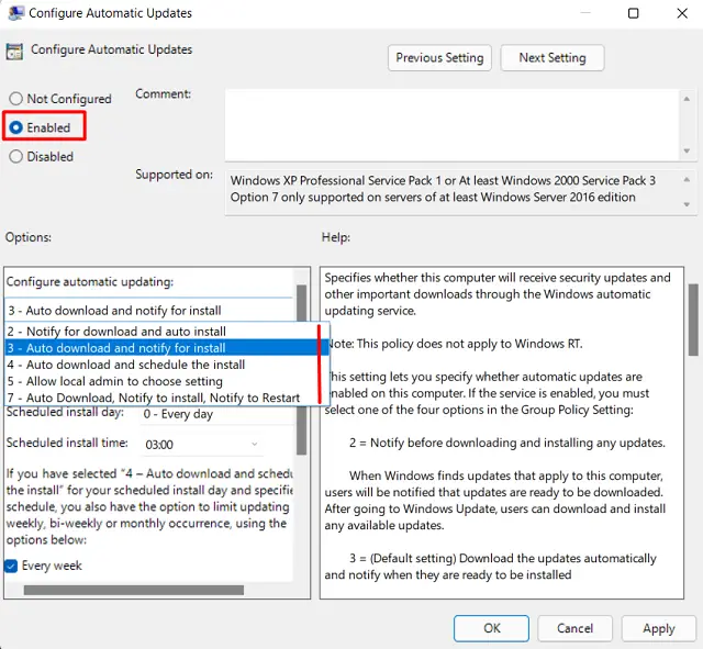 However, if you want to change the current configuration, re-visit the above path and enable the radio button that you have disabled just before i.e. Configure Automatic Updates.